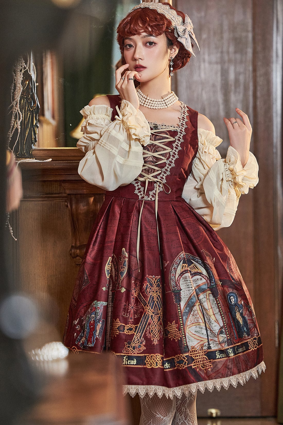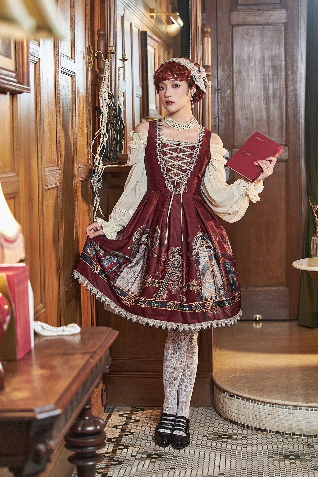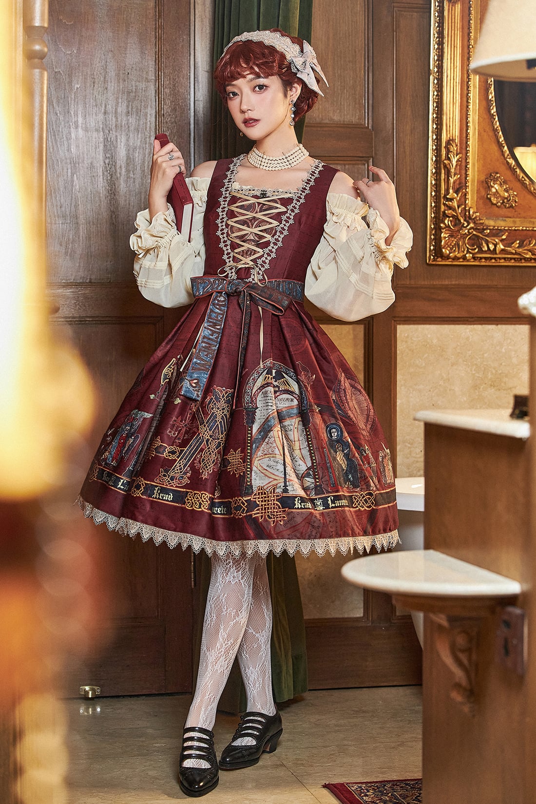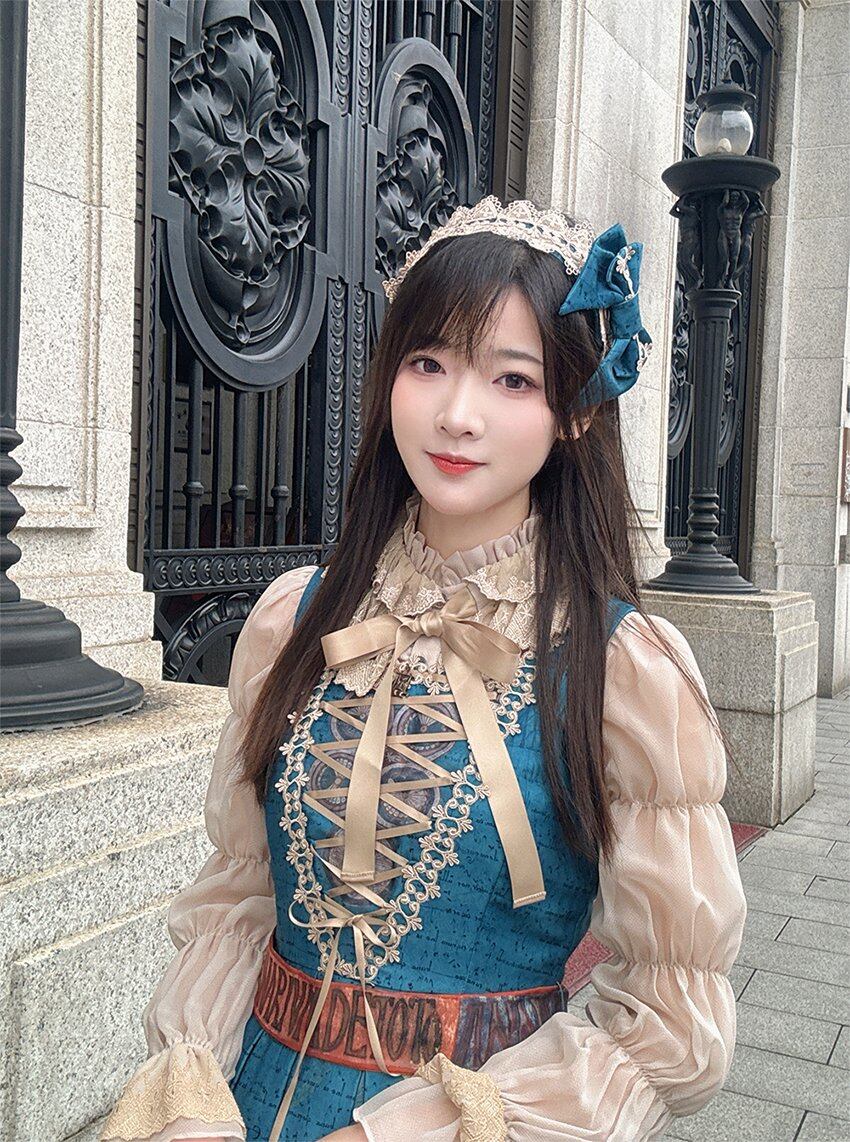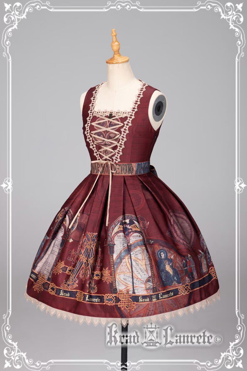 The jumperskirt is designed with a natural waistline, accentuated by a detachable belt featuring alphabet motifs. The bodice showcases a V-shaped lace-trimmed design, adorned with a custom KL logo metal charm at the chest, complemented by crisscross satin lacing that creates the illusion of a slimmer waistline. The skirt is constructed with box pleats and finished with triangular drapery-style lace along the hem, evoking a solemn and mysterious aura tinged with a sense of the forbidden. A detachable belt is included for versatile styling.